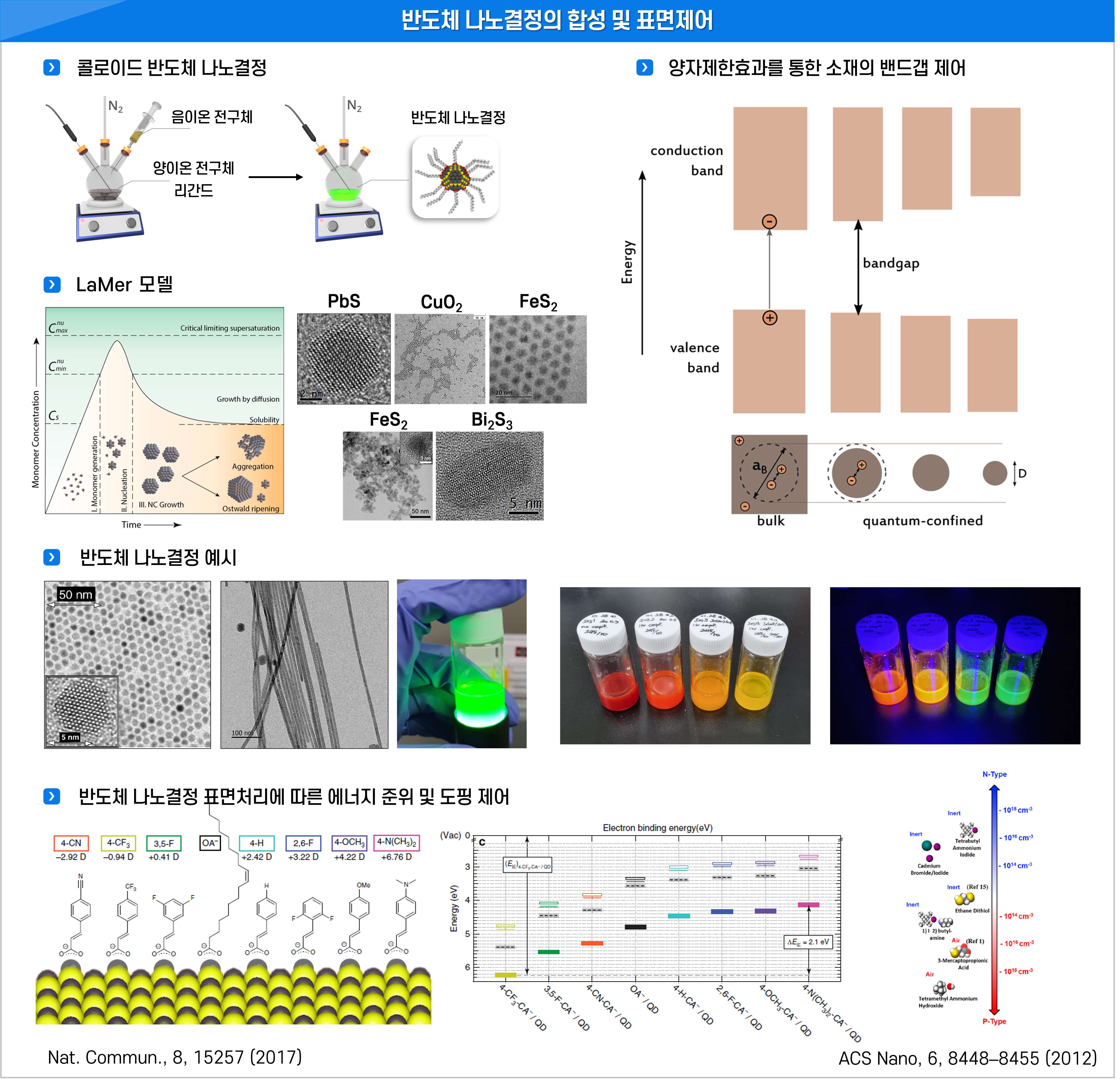 연구의 핵심인 수 나노미터(3~10 nm) 크기의 반도체 나노결정(Quantum Dots, QDs)은 크기에 따라 전기적·광학적 성질을 정밀하게 제어할 수 있는 혁신 소재입니다. 이를 바탕으로 광센서, 태양전지, 바이오 이미징, 디스플레이 등 첨단 산업의 핵심 소재로 활용되고 있습니다. 특히 나노결정의 표면 제어 기술은 소자의 계면 특성을 최적화함은 물론, 고효율 전기화학 촉매 분야로의 강력한 확장성을 제공합니다.