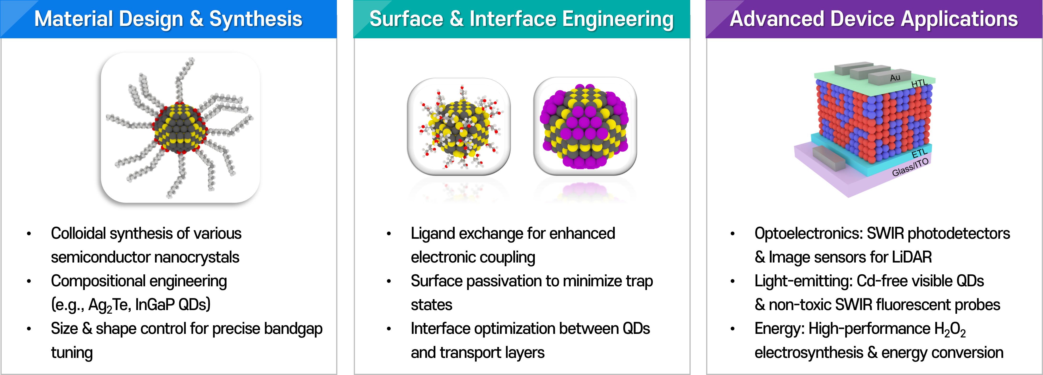 Quantum Dots (QDs), semiconductor nanocrystals measuring only 3–10 nm, are the cornerstone of our research and represent an innovative class of materials whose electrical and optical properties can be precisely tuned by size. Leveraging these unique characteristics, QDs have established themselves as essential materials in cutting-edge industries, including photodetectors, solar cells, bio-imaging, and displays. Notably, our expertise in surface engineering of nanocrystals not only optimizes the interface properties of electronic devices but also provides powerful scalability into the field of high-efficiency electrochemical catalysis.