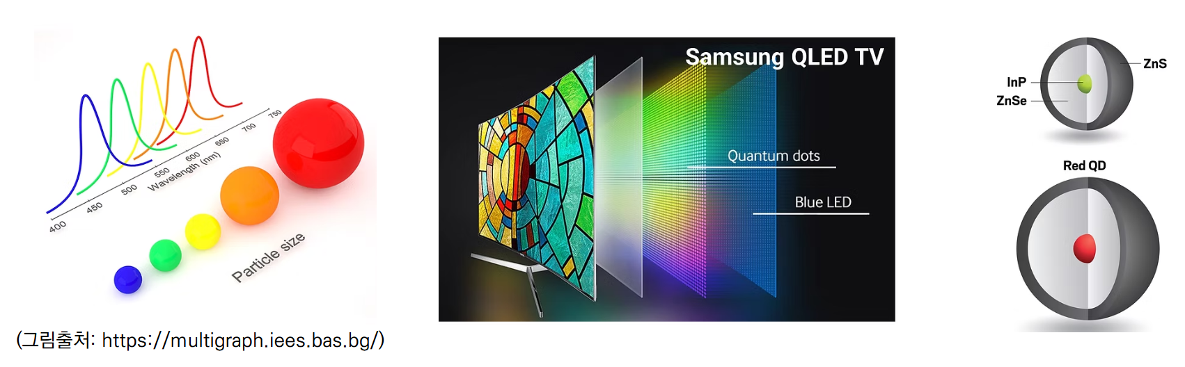 - QD 소재는 크기에 따라 다양한 색상을 낼 수 있어, 디스플레이 분야에서 널리 사용되고 있습니다. 대표적으로 현재 삼성의 QLED TV에서 녹색과 적색 빛을 내는 색변환 소재로 활용되고 있습니다.